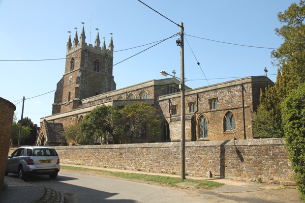 The church of St. Peter and St. Paul at Deddington is a spacious building of local ironstone standing on high ground on the east side of the market place. It comprises an aisleless chancel, a nave of four bays with wide aisles, north and south porches, a west tower, and a small crypt beneath the east end of the south aisle. The reconstruction of part of the church in the 17th century may have obscured evidence of the building's earlier development. There are no certain remains of the 12th-century church, but there are indications of a major rebuilding in the early 13th century. The three western bays of the chancel, the north and south doorways, the circular piers in the nave arcades, and the string courses at the western end of the south wall are of that date. The east wall of the south aisle shows signs that the aisle was once narrower, but the widening had evidently been carried out before the early 13th century. The vaulted crypt or charnel house (12 ft. square) is a later insertion, probably of the 15th century. In the later 13th century the chancel was extended eastwards by one bay. The north aisle, though probably achieving its full width to match the south aisle in the 13th century, contains no features earlier than the piscina and blocked doorway of c. 1300 at its east end; its windows are 14th-century and later. The head of a niche of similar date survives above the screen, south of the chancel arch. In the 14th century a piscina was placed in the south aisle and a three-light window in the south wall, east of the doorway; the nave arcades may also have been remodelled at that time. In the 15th century the nave was heightened to accommodate a clerestory, which included a window above the chancel arch. A large window was inserted in the south aisle, its mullions carried below the glazing to a window seat in the manner of Richard Winchcombe, the master-mason of Adderbury chancel (1408–19) and the Divinity School at Oxford (1424–40). Later in the century a clerestory was inserted in the chancel, and c. 1500 large east windows were inserted in both aisles. Another 15th-century window is in the south wall west of the porch. The medieval south porch, replaced in the 18th century, was surmounted by an upper room or parvise, traces of whose stairway are visible in the adjoining aisle wall; the present porch dates from 1865. The medieval tower, surmounted by a tall spire, 'the most noted of all Oxfordshire and seen the farthest', fell in March 1634 and broke down 'a great part of the body of the church'. The estimated cost of the rebuilding, £8,250, suggests that the damage was extensive. A brief for the collection of contributions was granted in 1635. The tower was partially rebuilt during the next few years, but work was suspended during the Civil War and not resumed until 1683 when Thomas Wood, an Oxford master-mason, contracted to complete it for £500 or £600. The tower was rebuilt from ground level, and is a notable example of the continuity of Gothic design; it is nearly 31 m. high, of four stages, clasped by huge diagonal buttresses, and crowned by eight pinnacles. The statues of St. Peter and St. Paul high on its west front seem to have been salvaged from the old steeple and to have been partly renovated in the 17th century; they were crudely restored in 1966. The west ends of both aisles were rebuilt after the fall of the tower and are pierced by elaborate Caroline Gothic windows; the north-west window of the north aisle may also have been rebuilt at that time. Medieval material appears to have been incorporated in the reconstruction of the arcade, but the use of glass as a packing course at the base of the easternmost pier of the north arcade implies post-medieval rebuilding; indeed the whole arcade may have been realigned, since its eastern respond partly blocks the former doorway to the roodloft. The octagonal piers towards the west of each arcade are later in date than the corresponding aisle walls, and, though 14th-century in general appearance, seem to be substantially of 17thcentury workmanship. If the arcades were rebuilt in the 17th century the clerestory, though Perpendicular in style, was presumably reconstructed at the same time. The north porch, with its unusual saucer-shaped Gothic vault, may also date from the 17th-century rebuilding. Until the Reformation the church contained several chantry chapels or altars, of which the most important, that of the Trinity guild, was presumably in the north aisle, the present Lady chapel, which contains the monument of William Billing (d. 1533), who desired to be buried in the guild chapel. Under the second window from the east in both aisles are the stone supports of stairs which presumably gave access to lofts over the screens enclosing the eastern chapels. The present south altar commemorates St. Thomas, recalling the medieval altar to him. A school was held in the church from 1673 until the early 19th century, probably in the south-west corner, which contained a hearth and was entered by a small doorway west of the porch. In the 18th century the west end of the nave was occupied by a singer's gallery, and another gallery was built at the west end of the south aisle in the early 19th century to seat the large congregations attracted by 'a popular preacher', presumably Richard Greaves or his curate, Hughes. In 1840 a new gallery was built at the west end of the nave to house an organ. In 1836–7 the arcades were 'restored to their original condition' by W. C. Risley, who at the same time gave a new pulpit and the controversial altar piece. In 1838 the chancel roof was restored and its partially blocked windows opened up at the expense of Risley and the Windsor chapter. Plans by Risley to restore the church to designs by J. M. Derick in 1842 were not carried out, but in 1843 the nave roof was rebuilt by Robert Franklin. In 1858 a general restoration was begun under G. E. Street, the diocesan architect, but dissension 