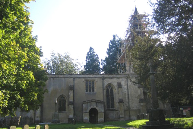 The nave has in the north wall a blocked 14thcentury arch of two chamfered orders formerly opening into the north transept. In the filling is a two-light window made up of 14th-century material. Further west is the fine late 12th-century north doorway of two semicircular orders with a moulded label with large beak-head stops. The inner order is moulded and partly covered by a cusped and foliated enrichment; the jambs have attached shafts with voluted angles to the inner order and free shafts with good foliage capitals to the outer, all with square abaci. The plain oak door retains the old scrolled iron-work. High above this doorway is an early 16th-century clearstory window of three lights with a square head, and further west, at a lower level, is a two-light 14th-century window similar to those in the chancel, with restored tracery. In the south wall is a wide pointed arch of 14th-century date and two continuous chamfered orders opening into the south transept. The blocked south doorway is of the same date as the north, and of two moulded semicircular orders, the outer resting on shafts with foliage capitals and the inner with a roll on the jambs. Above it is a clearstory window similar to but longer than that on the north. Further west are two 14th-century windows similar to that on the north and having a moulded string-course at the internal sill-course, repeated also on the opposite wall. Externally the nave has a plain moulded parapet. The 15thcentury roof is low-pitched with curved and moulded principals with traceried spandrels and moulded ridge and purlins. The 14th-century south transept has a two-light east window with a pointed head and a trefoil-headed piscina at the south end of the east wall. The south window is of four lights with net tracery. In the west wall is a two-light window similar to that on the east, and below it is a modern doorway. The roof, probably original, is of the trussed rafter type with one moulded tie-beam. The vestry on the north of the chancel has a large two-light 16thcentury east window with traces of an earlier window above it. In the west wall is a pointed doorway. It has a plastered roof and has been much cut about and altered. The north porch is of 18th or early 19th-century date with a keyed outer arch. The west tower is of three stages and has a narrow pointed tower arch of the 14th century of two orders on the east and three on the west face. The west doorway is modern, and above it is an early 16thcentury two-light window. In the north and south walls are square-headed loops, but the inner openings are round-headed and are apparently those of early windows. The second stage has plain square-headed windows on the north and south and the bell-chamber is lighted by two-light windows of late 13th-century date, with quatrefoils in the heads. The tower has diagonal buttresses and is finished with a shingled broach spire. The church is particularly rich in brasses and monuments; the former are in the chancel and include a good figure of William de Herleston, a priest of c. 1410, in the head of a floreated cross, most of which is gone, with a fragmentary marginal inscription and two coats of arms, a cross with a bend indented in the quarter. To the north is a small female figure of c. 1520 and the upper part of a male figure of about the same date with two sons below. To the south is a figure in civilian dress commemorating John Fettiplace (1602) with three coats of arms: Fettiplace impaling Braybrooke of Abingdon, Fettiplace impaling an unidentified coat which is repeated not impaled. There are also brass inscriptions to Thomas Todhunter, 1627, John Williamson, 1633, Richard Edmondson, 1674, and Nicholas Cook, 1603, all vicars of the parish. In the north wall of the chancel between the two doors is a 14th-century tomb recess with a cusped cinquefoiled arch, the points of which have carved heads or foliage bosses; the spandrels also have foliage and the ogee label has a final and rich crocketing and crocketed pinnacles at the sides. Opposite it in the south wall is a similar recess, the points of the cusping being all finished with heads; under this is a panelled altar tomb, the six panels each having a blank shield. On the tomb is a cross-legged recumbent effigy of about 1300 to 1310 with two angels at the head and a lion at the feet; there is no shield and the effigy is of freestone. In the centre of the chancel is a slab with a floreated cross in low relief much defaced. On the north wall of the nave is a handsome freestone monument to John Pleydell (1591) and Bridget his wife (1623) with Doric side pilasters, a rich cresting and cherubim, dragons, &c., as ornaments; the shield above bears the arms of Pleydell impaling Barker of Hurst. On the east wall of the south transept is an early 17th-century tablet with Ionic side pilasters to Sir George Hyde of Kingston Lisle and Katherine his wife, daughter of Sir Humphrey Ferrers. The two shields bear the arms of Hyde and Hyde quartering Ferrers of Tamworth. In the south transept wall are two tomb recesses of the beginning of the 14th century and exactly uniform; they are similar to those in the chancel and have feathered ogee labels and heads to the points of the cusping. Under the eastern is an altar tomb with nine armed weepers, each under a shallow ogee canopy, and on it is a well-carved oak effigy of a lady in a long mantle and wimple with two figures at the head and two dogs at the feet. Under the western recess is a plain altar tomb with a moulded cornice supporting another oak effigy of a widow or vowess with her feet on a dog, and two figures at the head. Near by on a modern base is an armed effigy of oak of about 1390 in a camail; the feet rest on a lion and the head on a helmet surmounted by a coronet and crest resembling a mushroom. The font has a plain cylindrical bowl of the 12th or 13th century. Across the arch of the south transept is an oak screen, of which the base and beam are modern